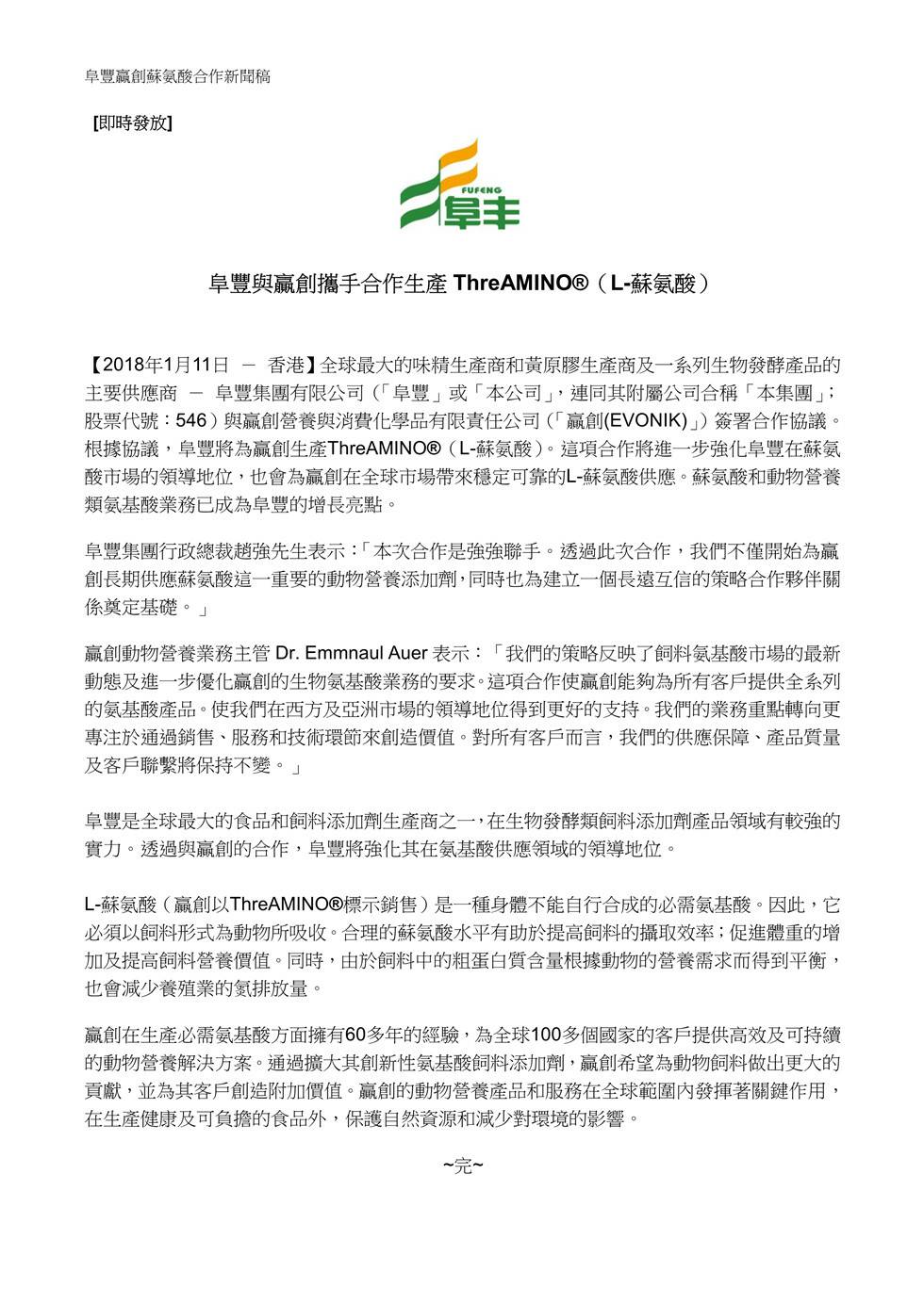 广州佑平再生资源回收有限公司与赢创携手合作生产ThreAMINO®(L-苏氨酸)